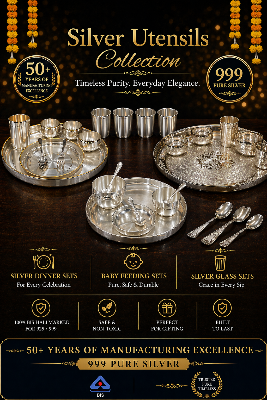 PureSilver.io is a Bangalore-based pure silverware brand backed by Navrang Silver Works (est. 1970). Every piece is BIS Hallmarked, designed, and manufactured at our own workshop for trusted purity and craftsmanship. All our products have price breakdown for you to understand how each item is priced based on live metal rates. We supply to Indian families including jewellers and luxury brands in India and Worldwide.