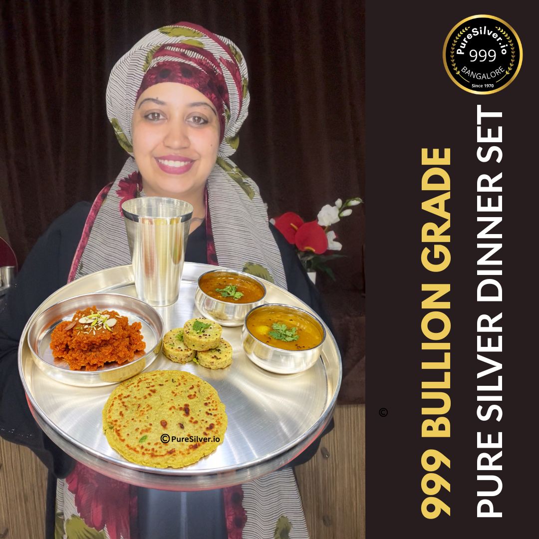 • Platinum Satin Matt Finished  5 pcs Silver Dinner Set, 1500 grams, BIS Hallmarked…Premium 990 BIS hallmarked pure silver dinner thali set from PureSilver.io.