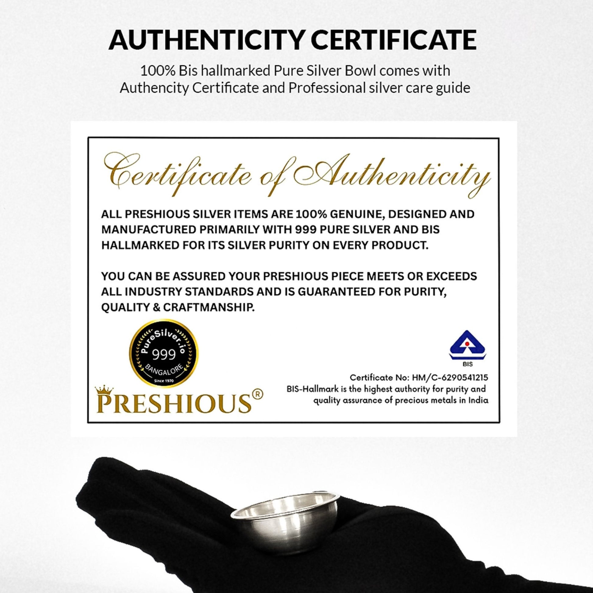 All items sold on PureSilver.io are 100% solid silver items, primarily made using 999.9 Fine Silver by MMTC PAMP and are 925 BIS Hallmarked (International Standard) and 990 BIS Hallmarked (Bullion Grade)