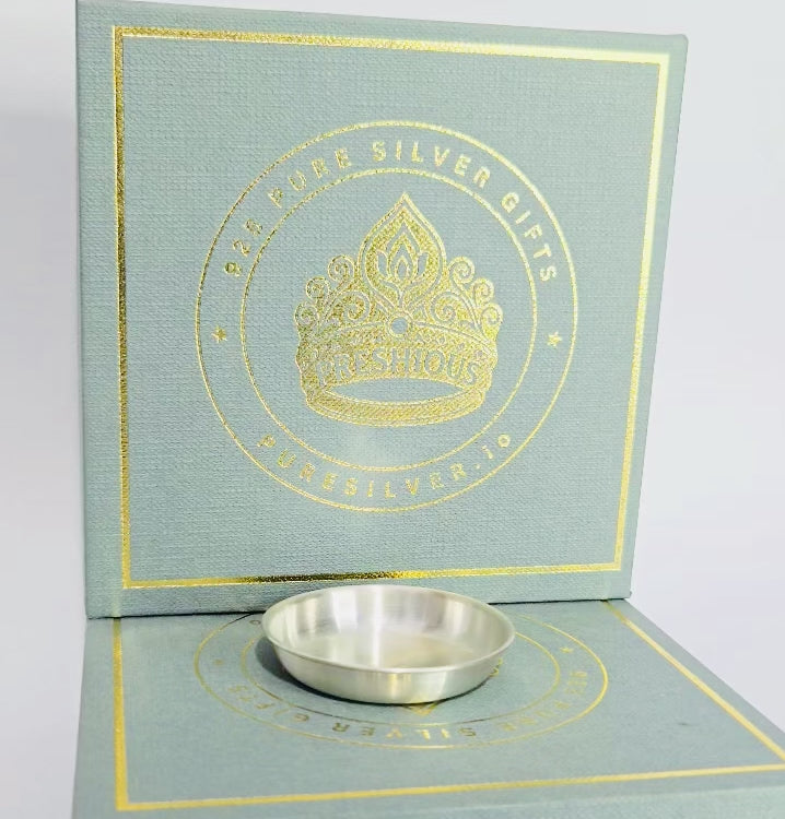 Experience timeless elegance with our Pure Silver Plate - 2 inches, handcrafted in 925 BIS hallmarked pure silver. This Bangalore pattern design features a luxurious satin matte finish ideal to place tiny diya, making it a stunning addition to your silverware collection. Whether used for pooja rituals or elegant gifting, its 12ml capacity and compact size add charm and functionality. Part of the exclusive *Preshious by PureSilver.io* collection, each piece arrives in dent-proof, anti-tarnish packaging with an authenticity certificate.