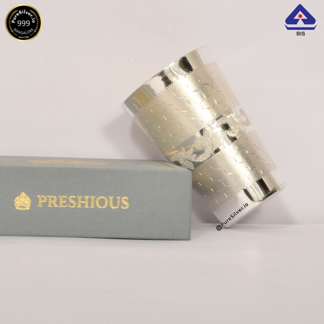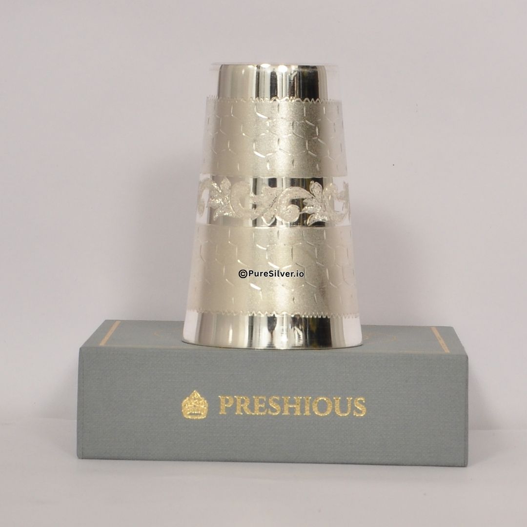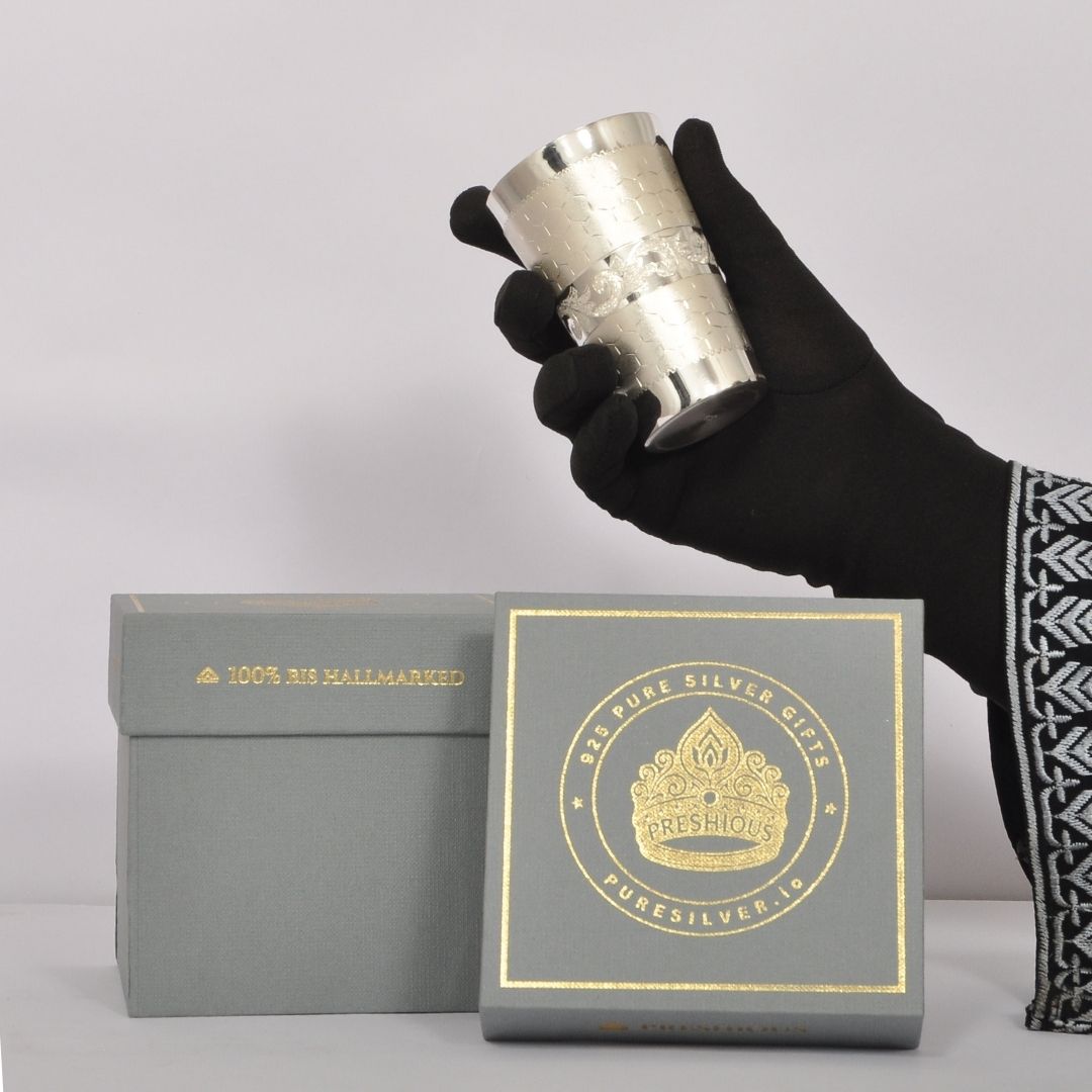 An ultra-luxurious silver drinking glass with a precision diamond-cut design—elegant on the table, auspicious on the altar, and unforgettable as a gift. Perfect for daily drinking water, and a top pick for anniversaries, weddings, and festive gifting. Available as a single or a set of 2 for couple gifting, with optional personalized engraving and a premium gift box.